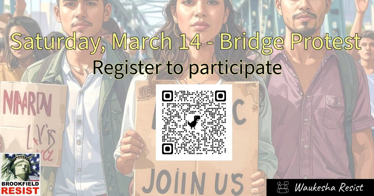 March 14 Bridge Brigade with Brookfield and Waukesha Resist groups. One hour shifts, everything provided. Plenty of free parking too. Why must you register? Because you need to pick the shift you want to work. Sign up for one or two 1 hour shifts.