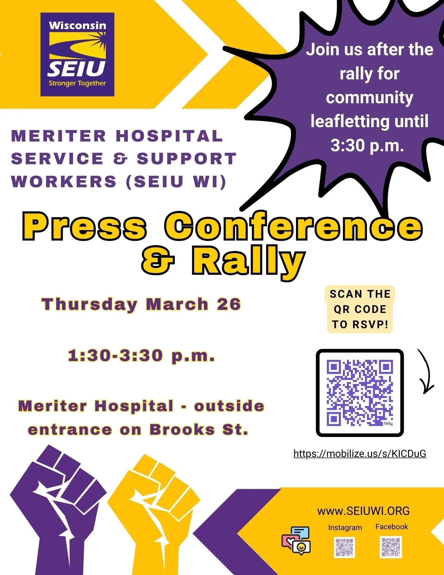 Madison: Meriter Service & Support Workers (SEIU WI) Press Conference, Rally, & Community Leafletting Thursday, March 26, 2026 1:30 PM 3:30 PM Meriter Hospital outside entrance on Brooks St 202 S Park St Madison, WI, 53715 United States (map) Google Calendar ICS https://www.mobilize.us/mobilize/event/922569/