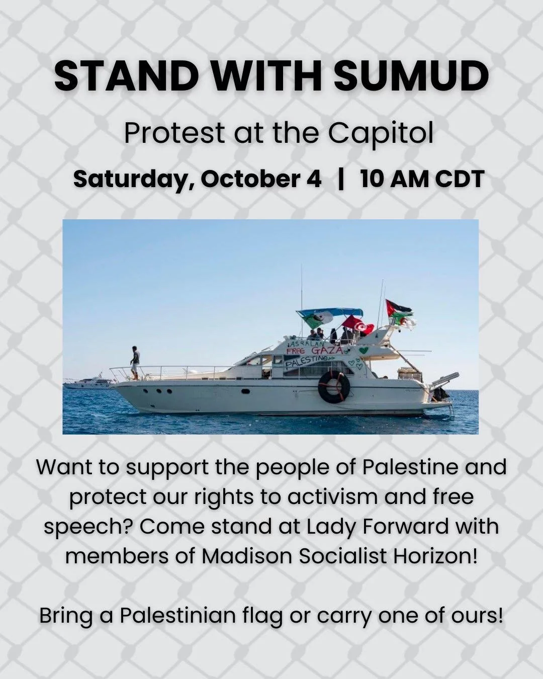 Madison: Stand with Sumud Protest at the Capitol Saturday, October 4, 2025 10:00 AM 12:00 PM Forward Statue State Street Madison, WI, 53703 United States (map) Google Calendar ICS