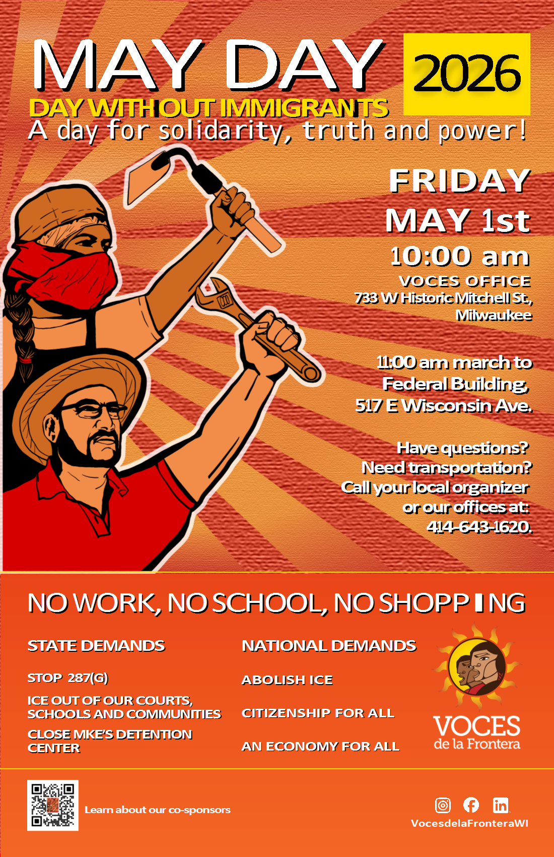 Milwaukee: Day Without Immigrants May Day 2026 Rally & March Friday, May 1, 2026 10:00 AM 2:00 PM Voces Office 733 West Historic Mitchell Street Milwaukee, WI, 53204 United States (map) Google Calendar ICS https://www.facebook.com/events/963201492800501