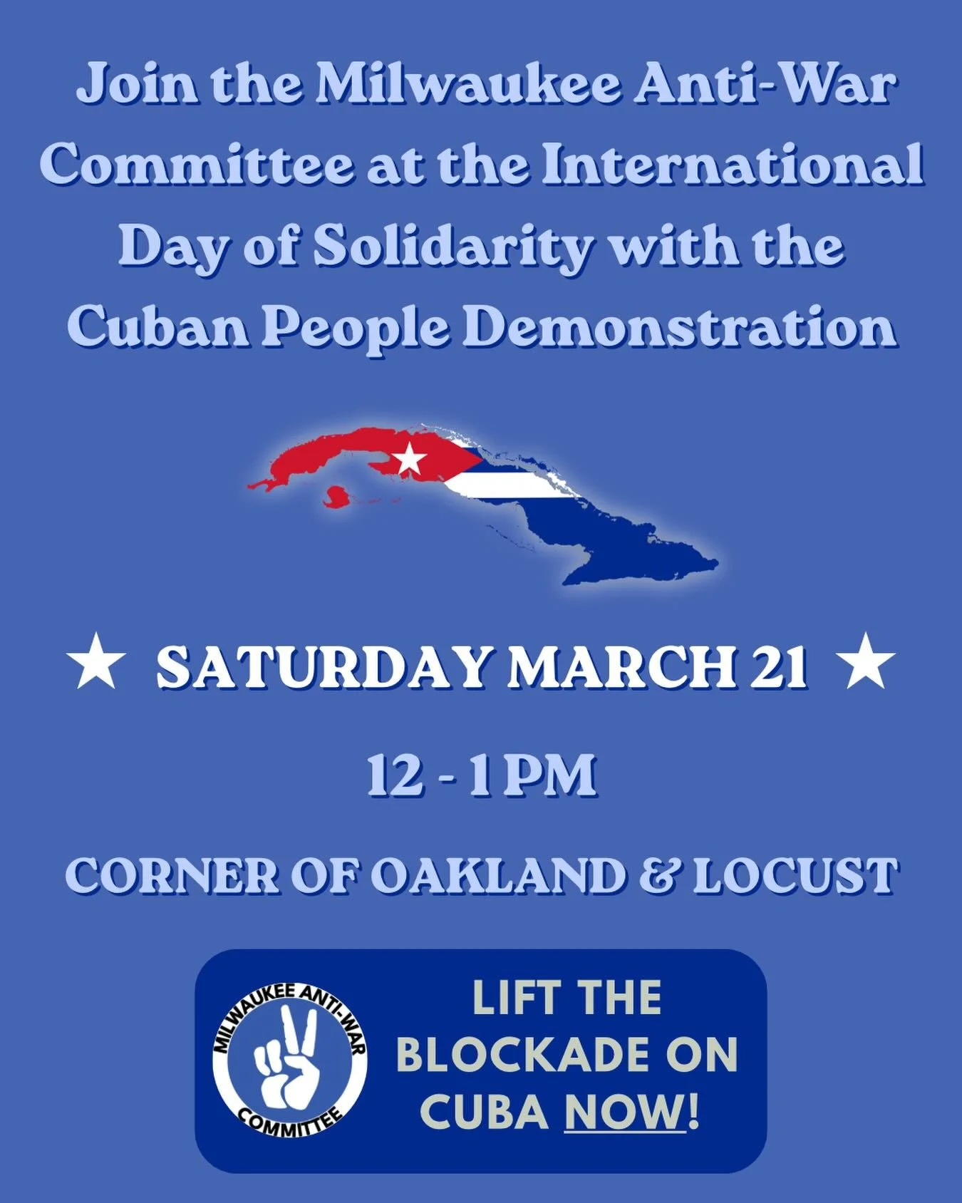 Back to All Events Milwaukee: International Day of Solidarity With the Cuban People Saturday, March 21, 2026 12:00 PM 1:00 PM Corner of Oakland & Locust Milwaukee, WI, 53211 United States (map) Google Calendar ICS