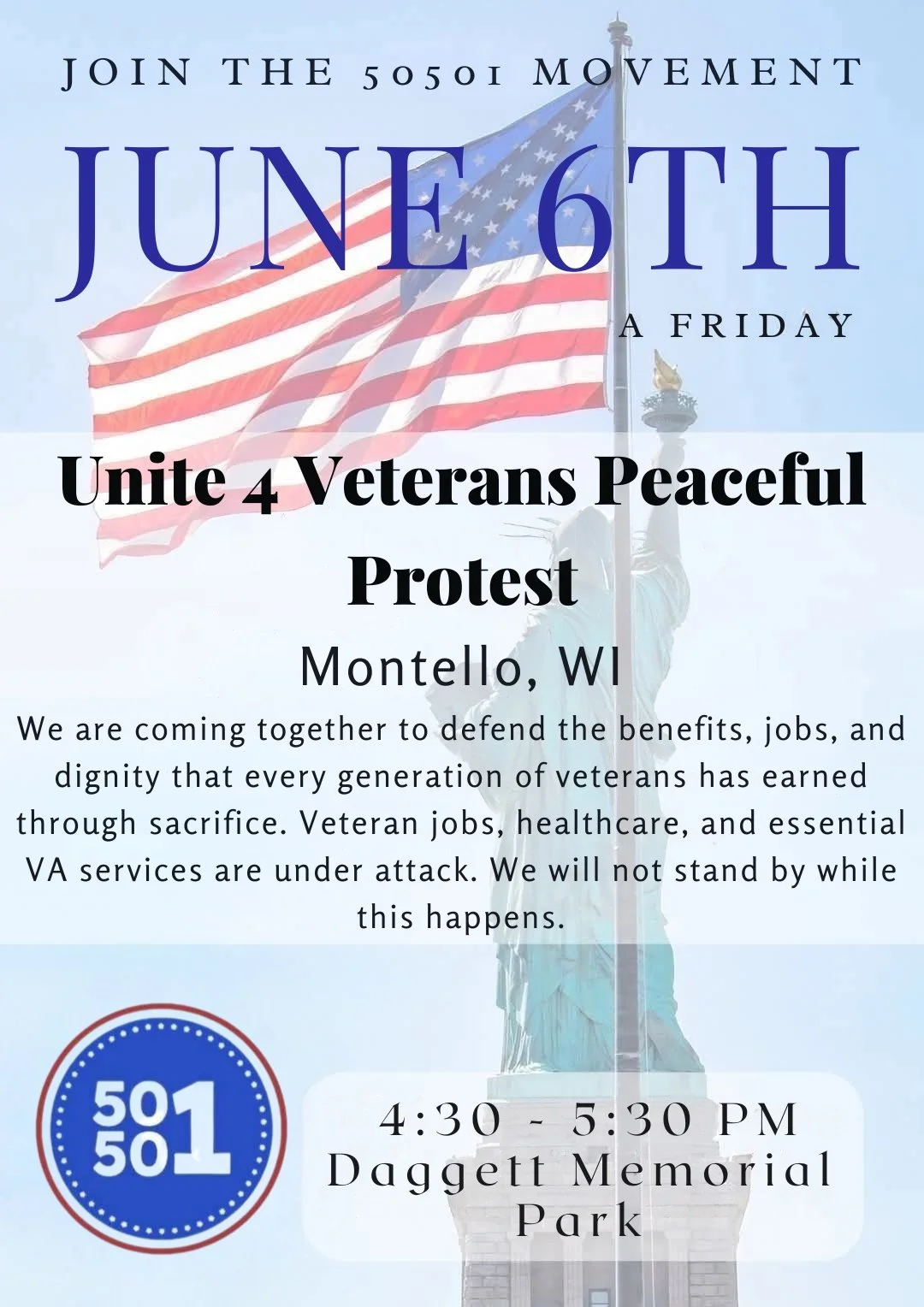We will hold our local rally in solidarity with those gathering at the National Mall in Washington, D.C., for the Unite for Veterans, Unite for America Rally. We are coming together to defend the benefits, jobs, and dignity that every generation of veterans has earned through sacrifice. Veteran jobs, healthcare, and essential VA services are under attack. We will not stand by while this happens. More info at https://www.unite4veterans.org/