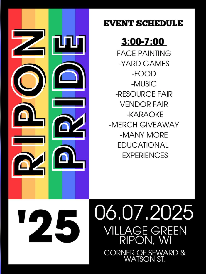 On Saturday, June 7th, the fourth annual Ripon Pride Rally will take place from 3-7pm at the Village Green in Ripon Wisconsin. This will be a family-friendly event. Many resource groups and other organizations will be attending.